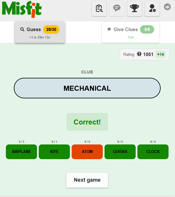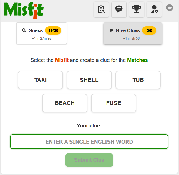 Another player, a cluegiver, tried connecting 4 words out of 5 with a single, one-word clue. You get one of those 5 words, and have to guess whether your word is Match (one of the 4 connected words), or the Misfit (the last remaining word that was not connected by the clue). Try to have the best accuracy and climb the leaderboards!
